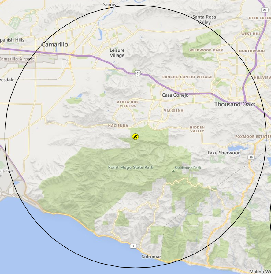 Our count circle, a 7.5 mile radius centered at 34.148945, -118.969918.